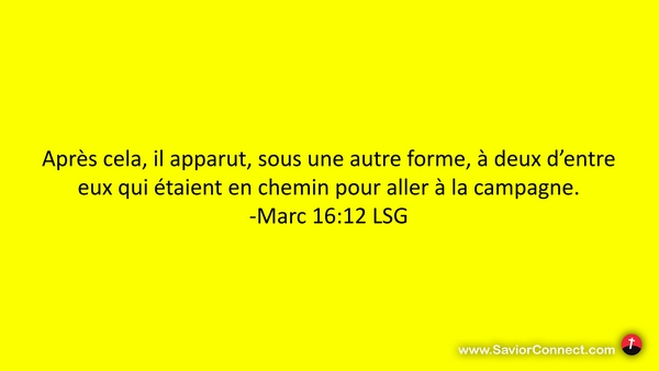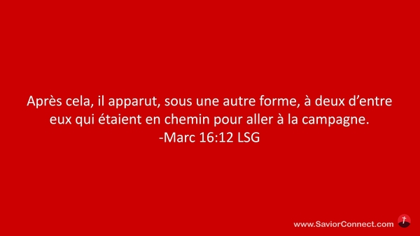 Après cela, il apparut, sous une autre forme, à deux d'entre eux qui étaient en chemin pour aller à la campagne. -Marc 16:12 LSG