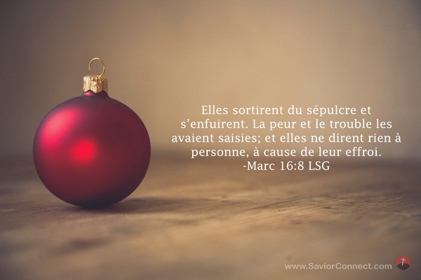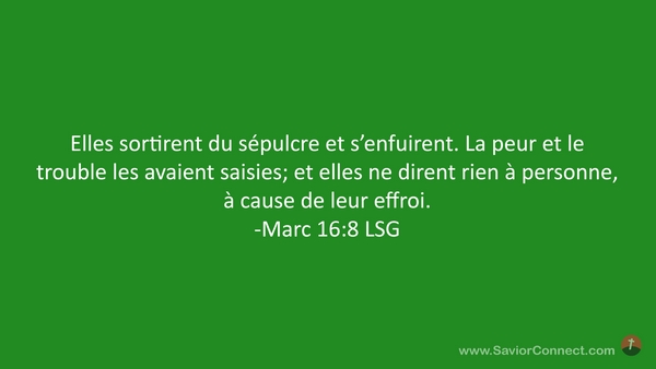 Elles sortirent du sépulcre et s'enfuirent. La peur et le trouble les avaient saisies; et elles ne dirent rien à personne, à cause de leur effroi. -Marc 16:8 LSG