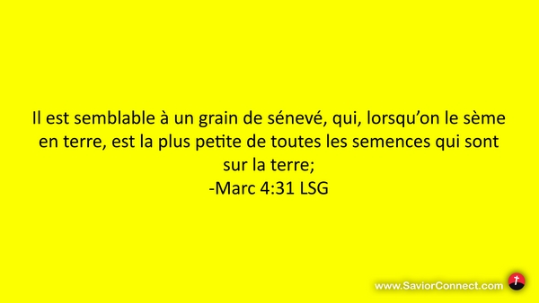 Il est semblable à un grain de sénevé, qui, lorsqu'on le sème en terre, est la plus petite de toutes les semences qui sont sur la terre; -Marc 4:31 LSG