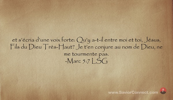 et s'écria d'une voix forte: Qu'y a-t-il entre moi et toi, Jésus, Fils du Dieu Très-Haut? Je t'en conjure au nom de Dieu, ne me tourmente pas. -Marc 5:7 LSG