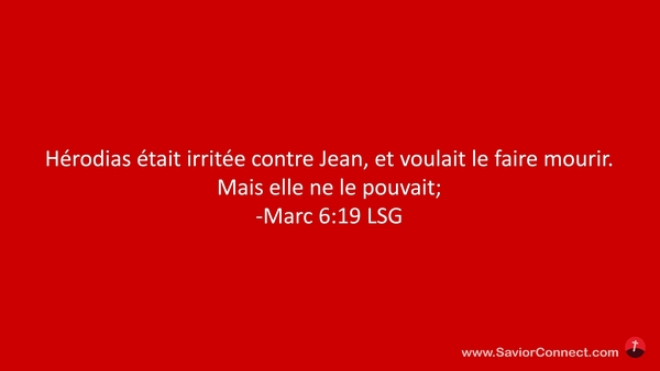 Hérodias était irritée contre Jean, et voulait le faire mourir. Mais elle ne le pouvait; -Marc 6:19 LSG