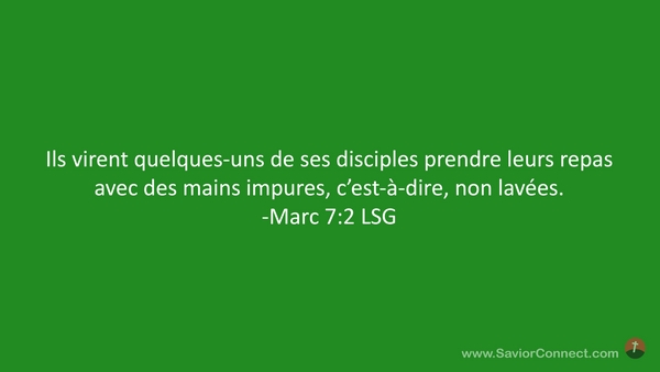 Ils virent quelques-uns de ses disciples prendre leurs repas avec des mains impures, c'est-à-dire, non lavées. -Marc 7:2 LSG