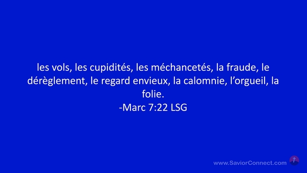 les vols, les cupidités, les méchancetés, la fraude, le dérèglement, le regard envieux, la calomnie, l'orgueil, la folie. -Marc 7:22 LSG
