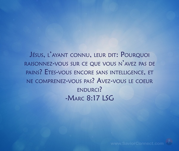 Jésus, l'ayant connu, leur dit: Pourquoi raisonnez-vous sur ce que vous n'avez pas de pains? Etes-vous encore sans intelligence, et ne comprenez-vous pas? Avez-vous le coeur endurci? -Marc 8:17 LSG