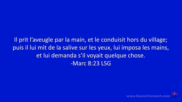 Il prit l'aveugle par la main, et le conduisit hors du village; puis il lui mit de la salive sur les yeux, lui imposa les mains, et lui demanda s'il voyait quelque chose. -Marc 8:23 LSG