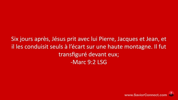 Six jours après, Jésus prit avec lui Pierre, Jacques et Jean, et il les conduisit seuls à l'écart sur une haute montagne. Il fut transfiguré devant eux; -Marc 9:2 LSG