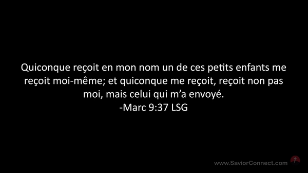 Quiconque reçoit en mon nom un de ces petits enfants me reçoit moi-même; et quiconque me reçoit, reçoit non pas moi, mais celui qui m'a envoyé. -Marc 9:37 LSG