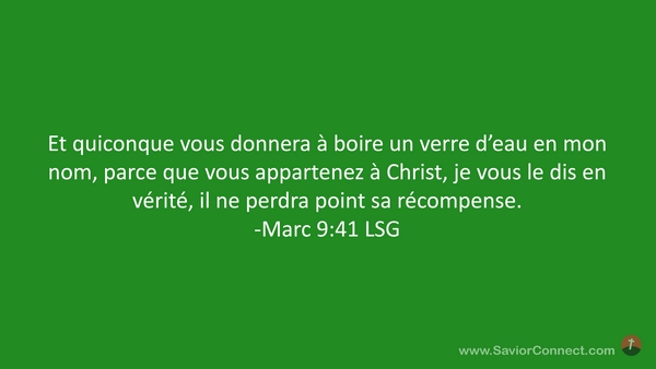 Et quiconque vous donnera à boire un verre d'eau en mon nom, parce que vous appartenez à Christ, je vous le dis en vérité, il ne perdra point sa récompense. -Marc 9:41 LSG
