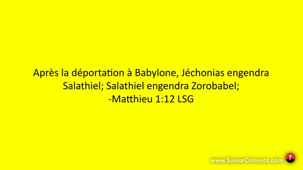 Après la déportation à Babylone, Jéchonias engendra Salathiel; Salathiel engendra Zorobabel; -Matthieu 1:12 LSG