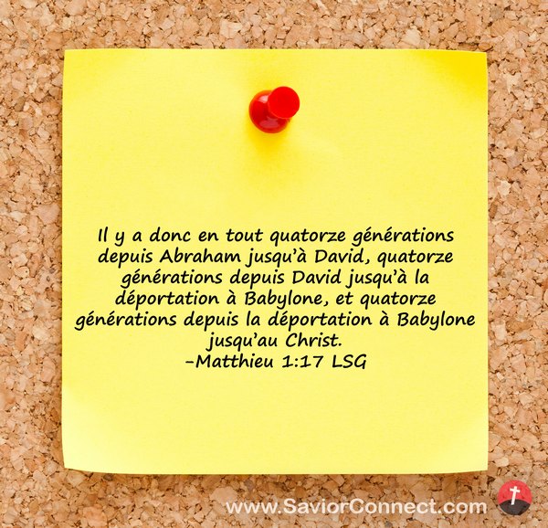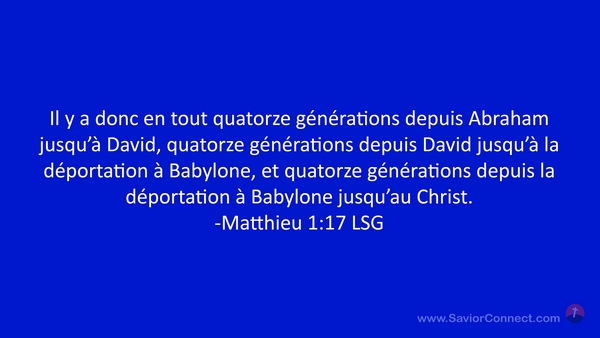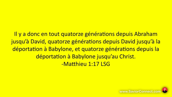 Il y a donc en tout quatorze générations depuis Abraham jusqu'à David, quatorze générations depuis David jusqu'à la déportation à Babylone, et quatorze générations depuis la déportation à Babylone jusqu'au Christ. -Matthieu 1:17 LSG