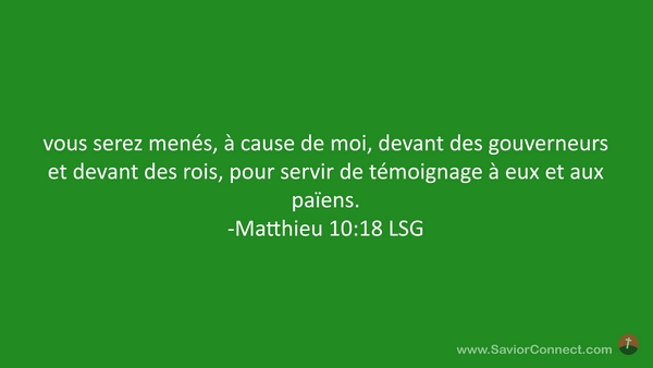 vous serez menés, à cause de moi, devant des gouverneurs et devant des rois, pour servir de témoignage à eux et aux païens. -Matthieu 10:18 LSG