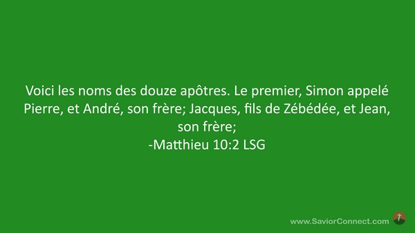 Voici les noms des douze apôtres. Le premier, Simon appelé Pierre, et André, son frère; Jacques, fils de Zébédée, et Jean, son frère; -Matthieu 10:2 LSG