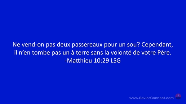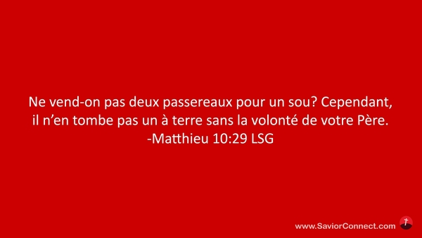Ne vend-on pas deux passereaux pour un sou? Cependant, il n'en tombe pas un à terre sans la volonté de votre Père. -Matthieu 10:29 LSG