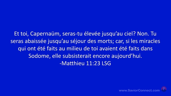 Et toi, Capernaüm, seras-tu élevée jusqu'au ciel? Non. Tu seras abaissée jusqu'au séjour des morts; car, si les miracles qui ont été faits au milieu de toi avaient été faits dans Sodome, elle subsisterait encore aujourd'hui. -Matthieu 11:23 LSG