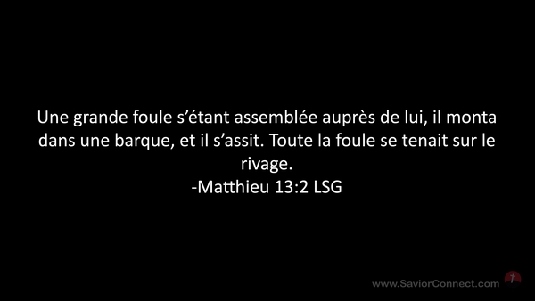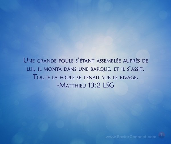 Une grande foule s'étant assemblée auprès de lui, il monta dans une barque, et il s'assit. Toute la foule se tenait sur le rivage. -Matthieu 13:2 LSG