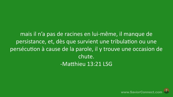 mais il n'a pas de racines en lui-même, il manque de persistance, et, dès que survient une tribulation ou une persécution à cause de la parole, il y trouve une occasion de chute. -Matthieu 13:21 LSG