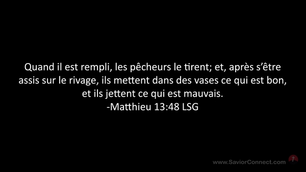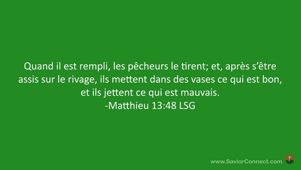 Quand il est rempli, les pêcheurs le tirent; et, après s'être assis sur le rivage, ils mettent dans des vases ce qui est bon, et ils jettent ce qui est mauvais. -Matthieu 13:48 LSG