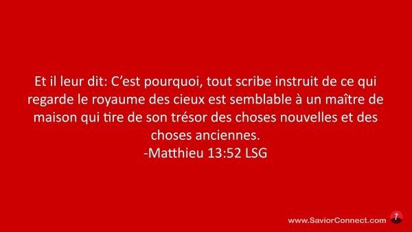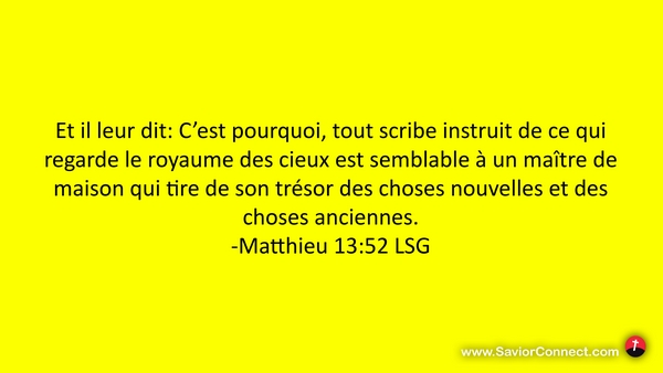 Et il leur dit: C'est pourquoi, tout scribe instruit de ce qui regarde le royaume des cieux est semblable à un maître de maison qui tire de son trésor des choses nouvelles et des choses anciennes. -Matthieu 13:52 LSG