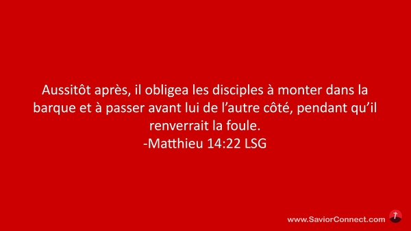 Aussitôt après, il obligea les disciples à monter dans la barque et à passer avant lui de l'autre côté, pendant qu'il renverrait la foule. -Matthieu 14:22 LSG