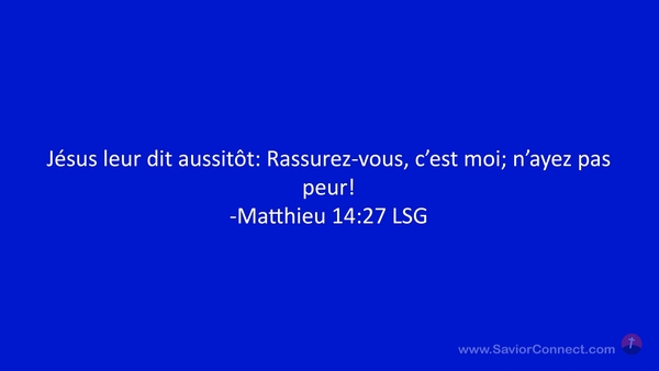 Jésus leur dit aussitôt: Rassurez-vous, c'est moi; n'ayez pas peur! -Matthieu 14:27 LSG