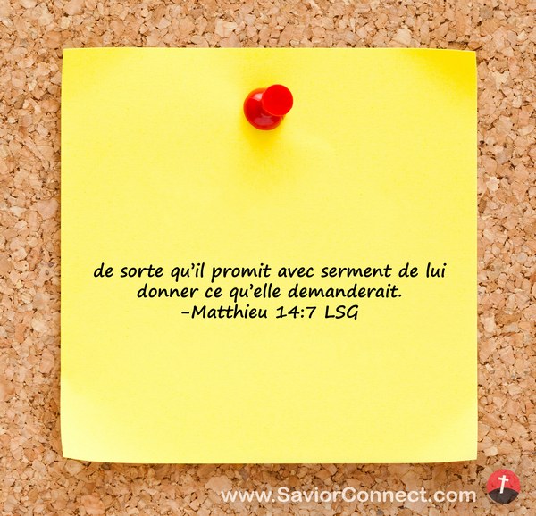 de sorte qu'il promit avec serment de lui donner ce qu'elle demanderait. -Matthieu 14:7 LSG