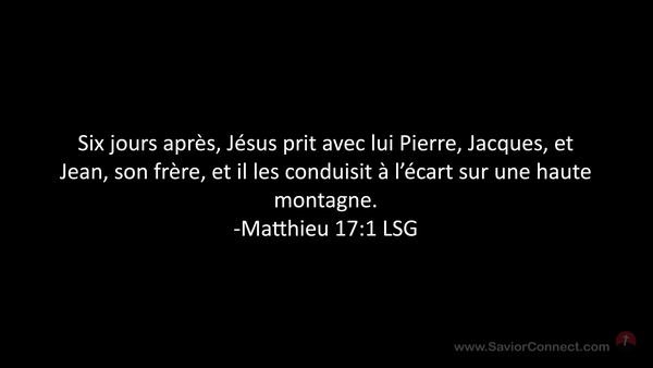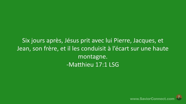 Six jours après, Jésus prit avec lui Pierre, Jacques, et Jean, son frère, et il les conduisit à l'écart sur une haute montagne. -Matthieu 17:1 LSG