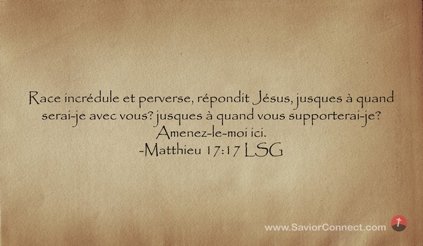 Race incrédule et perverse, répondit Jésus, jusques à quand serai-je avec vous? jusques à quand vous supporterai-je? Amenez-le-moi ici. -Matthieu 17:17 LSG