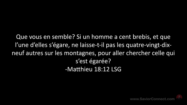 Que vous en semble? Si un homme a cent brebis, et que l'une d'elles s'égare, ne laisse-t-il pas les quatre-vingt-dix-neuf autres sur les montagnes, pour aller chercher celle qui s'est égarée? -Matthieu 18:12 LSG