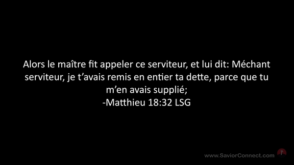 Alors le maître fit appeler ce serviteur, et lui dit: Méchant serviteur, je t'avais remis en entier ta dette, parce que tu m'en avais supplié; -Matthieu 18:32 LSG