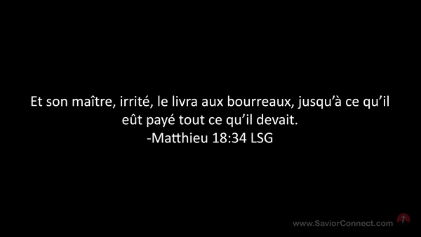 Et son maître, irrité, le livra aux bourreaux, jusqu'à ce qu'il eût payé tout ce qu'il devait. -Matthieu 18:34 LSG