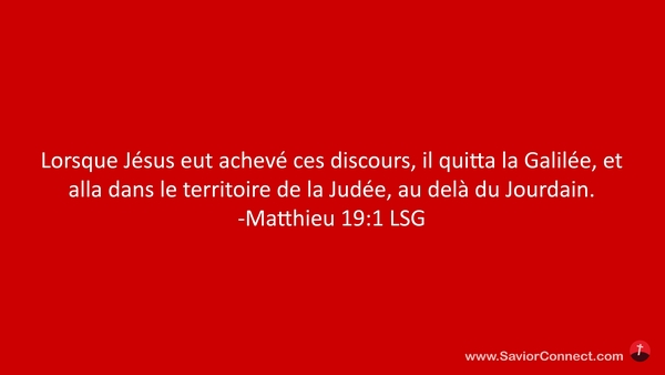 Lorsque Jésus eut achevé ces discours, il quitta la Galilée, et alla dans le territoire de la Judée, au delà du Jourdain. -Matthieu 19:1 LSG