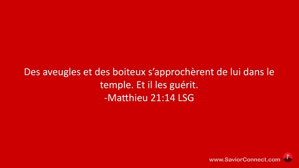 Des aveugles et des boiteux s'approchèrent de lui dans le temple. Et il les guérit. -Matthieu 21:14 LSG