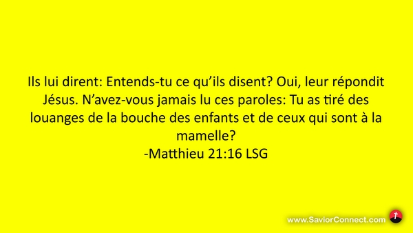 Ils lui dirent: Entends-tu ce qu'ils disent? Oui, leur répondit Jésus. N'avez-vous jamais lu ces paroles: Tu as tiré des louanges de la bouche des enfants et de ceux qui sont à la mamelle? -Matthieu 21:16 LSG