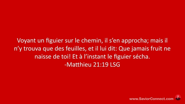 Voyant un figuier sur le chemin, il s'en approcha; mais il n'y trouva que des feuilles, et il lui dit: Que jamais fruit ne naisse de toi! Et à l'instant le figuier sécha. -Matthieu 21:19 LSG