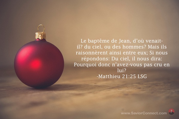 Le baptême de Jean, d'où venait-il? du ciel, ou des hommes? Mais ils raisonnèrent ainsi entre eux; Si nous répondons: Du ciel, il nous dira: Pourquoi donc n'avez-vous pas cru en lui? -Matthieu 21:25 LSG