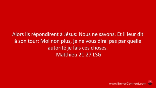 Alors ils répondirent à Jésus: Nous ne savons. Et il leur dit à son tour: Moi non plus, je ne vous dirai pas par quelle autorité je fais ces choses. -Matthieu 21:27 LSG