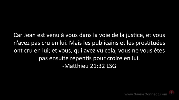 Car Jean est venu à vous dans la voie de la justice, et vous n'avez pas cru en lui. Mais les publicains et les prostituées ont cru en lui; et vous, qui avez vu cela, vous ne vous êtes pas ensuite repentis pour croire en lui. -Matthieu 21:32 LSG