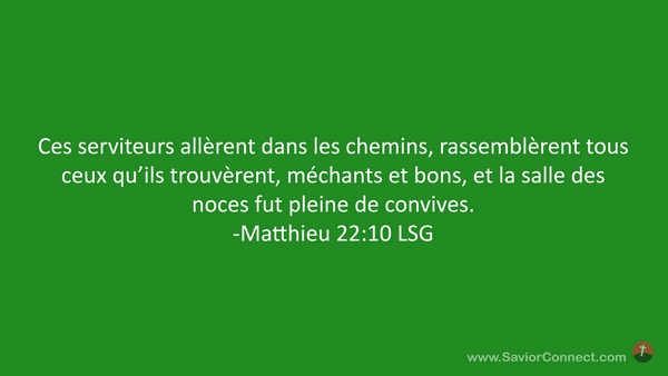 Ces serviteurs allèrent dans les chemins, rassemblèrent tous ceux qu'ils trouvèrent, méchants et bons, et la salle des noces fut pleine de convives. -Matthieu 22:10 LSG