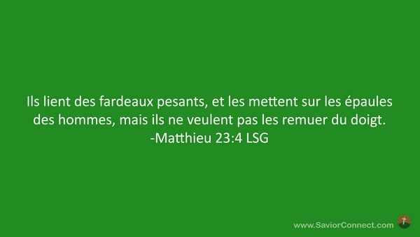 Ils lient des fardeaux pesants, et les mettent sur les épaules des hommes, mais ils ne veulent pas les remuer du doigt. -Matthieu 23:4 LSG