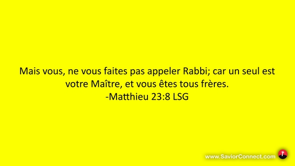 Mais vous, ne vous faites pas appeler Rabbi; car un seul est votre Maître, et vous êtes tous frères. -Matthieu 23:8 LSG