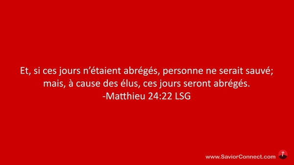 Et, si ces jours n'étaient abrégés, personne ne serait sauvé; mais, à cause des élus, ces jours seront abrégés. -Matthieu 24:22 LSG
