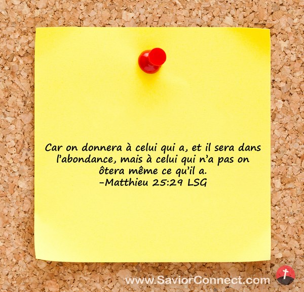 Car on donnera à celui qui a, et il sera dans l'abondance, mais à celui qui n'a pas on ôtera même ce qu'il a. -Matthieu 25:29 LSG