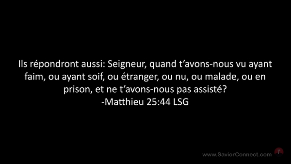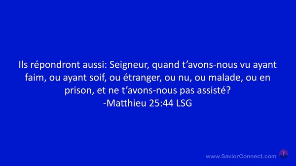 Ils répondront aussi: Seigneur, quand t'avons-nous vu ayant faim, ou ayant soif, ou étranger, ou nu, ou malade, ou en prison, et ne t'avons-nous pas assisté? -Matthieu 25:44 LSG