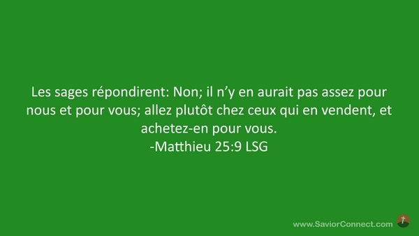 Les sages répondirent: Non; il n'y en aurait pas assez pour nous et pour vous; allez plutôt chez ceux qui en vendent, et achetez-en pour vous. -Matthieu 25:9 LSG