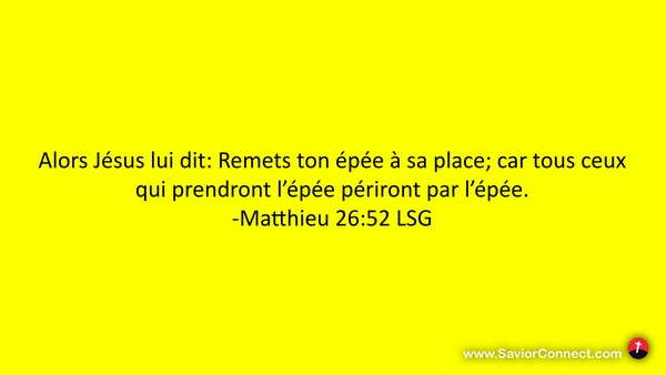 Alors Jésus lui dit: Remets ton épée à sa place; car tous ceux qui prendront l'épée périront par l'épée. -Matthieu 26:52 LSG