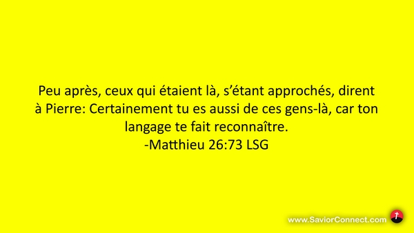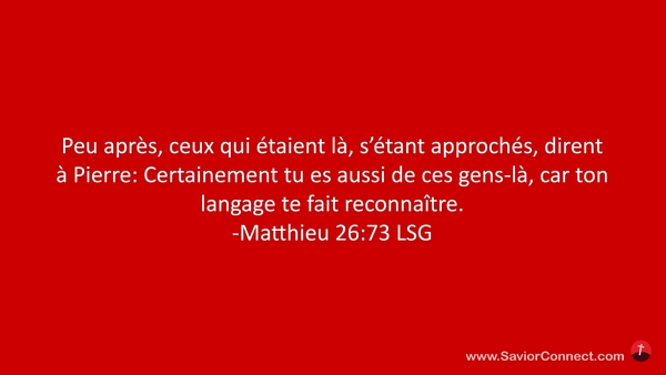 Peu après, ceux qui étaient là, s'étant approchés, dirent à Pierre: Certainement tu es aussi de ces gens-là, car ton langage te fait reconnaître. -Matthieu 26:73 LSG