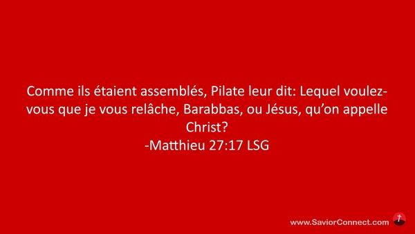 Comme ils étaient assemblés, Pilate leur dit: Lequel voulez-vous que je vous relâche, Barabbas, ou Jésus, qu'on appelle Christ? -Matthieu 27:17 LSG