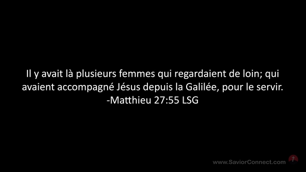 Il y avait là plusieurs femmes qui regardaient de loin; qui avaient accompagné Jésus depuis la Galilée, pour le servir. -Matthieu 27:55 LSG
