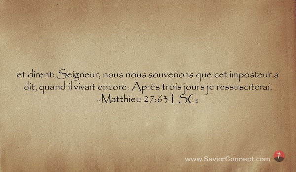 et dirent: Seigneur, nous nous souvenons que cet imposteur a dit, quand il vivait encore: Après trois jours je ressusciterai. -Matthieu 27:63 LSG