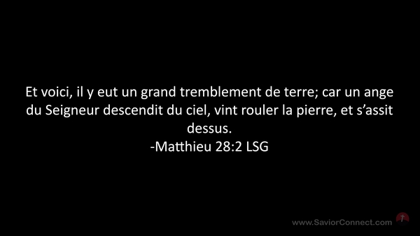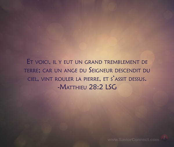 Et voici, il y eut un grand tremblement de terre; car un ange du Seigneur descendit du ciel, vint rouler la pierre, et s'assit dessus. -Matthieu 28:2 LSG